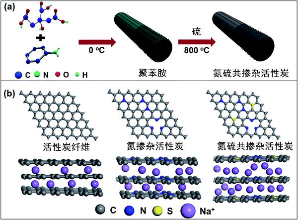 圖1:(a)氮硫共摻雜活性炭合成的示意圖,以及(b)具有不同幾何構型和不同層間距離的三種活性炭對鈉儲存的行為。