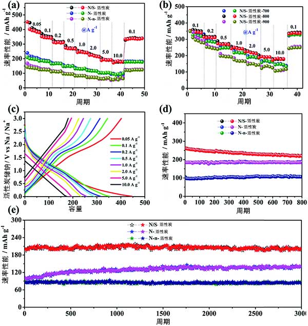 為了進一步描述制成活性炭的電化學行為,進行循環伏安法和恒電流充電放電測試。為了證明活性炭的優點,還在相同的質量負載下測試了幾種活性炭的Na儲存性能,圖2a顯示了在0.05至10Ag-1的不同電流密度下測試5個循環。與其他兩個樣品相比,氮硫共摻雜活性炭顯示出優異的速率性能,在高速測量之后仍然可以恢復高比容量。對于沒有S摻雜的活性炭,當電流密度增加時,電極提供的容量降低。相比之下,不同電流密度下的恒電流充電放電曲線進一步證實了這些速率的結果。因此,氮硫共摻雜活性炭電極表現出比其他對照樣品好得多的速率性能和優異的鈉儲存性能。
