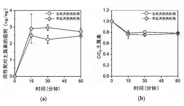 圖1:(a)吸附的土臭素的量和(b)在沒有和存在天然有機物質的情況下活性炭上殘留的土臭素的比例。