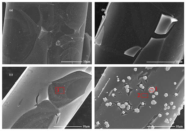 圖1中的FESEM圖像顯示了氧化鈦改性活性炭含銀纖維的表面形態。在活性炭含銀纖維的表面上觀察到許多納米顆粒,活性炭表面的這些銀納米顆粒被二氧化鈦薄膜包覆,隨著濃度的增加,它們的直徑從約0.2μm急劇增加到1μm。當濃度達到0.4mol/L時,銀納米顆粒不能被二氧化鈦薄膜完全覆蓋。而且,活性炭纖維上的二氧化鈦膜的厚度不均勻。