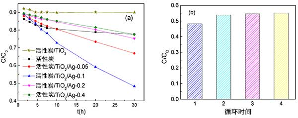 圖2:(a)這幾種活性炭的亞甲基藍去除效果,(b)經歷循環試驗的活性炭含銀纖維的亞甲基藍去除效果。