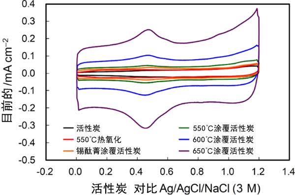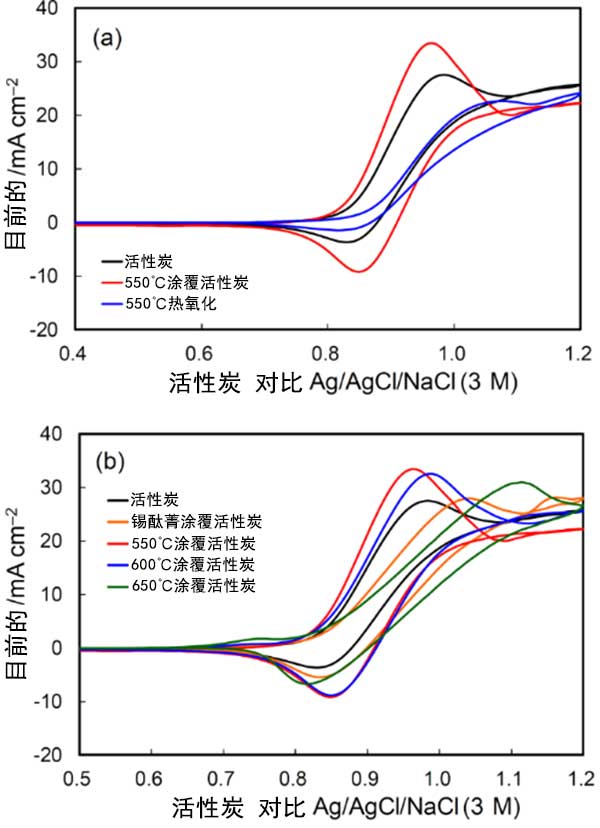 在沒(méi)有釩離子的酸性電解質(zhì)中獲得的循環(huán)伏安圖顯示在圖3中。伏安圖中的電流由三個(gè)組分組成,即活性炭-電解質(zhì)界面處的電化學(xué)雙層充電電流,以及由于表面官能團(tuán)的氧化還原反應(yīng)和活性炭表面氧化引起的法拉第電流。電化學(xué)雙層充電產(chǎn)生恒定電流和矩形CV形狀。電流取決于基面和邊緣平面的曝光程度,在0.5V附近的寬氧化還原峰和0.8V以上的氧化電流分別歸因于醌/氫醌樣表面官能團(tuán)的氧化還原反應(yīng)和活性炭表面氧化。這些電流在熱氧化后增加,并且在錫酞菁涂覆活性炭的熱氧化期間隨著溫度的升高而增加。電化學(xué)雙層電流的增加歸因于邊緣平面的暴露,這與拉曼光譜一致。對(duì)于錫酞菁涂覆活性炭觀察到的活性炭表面氧化電流意味著高表面粗糙度的發(fā)展。