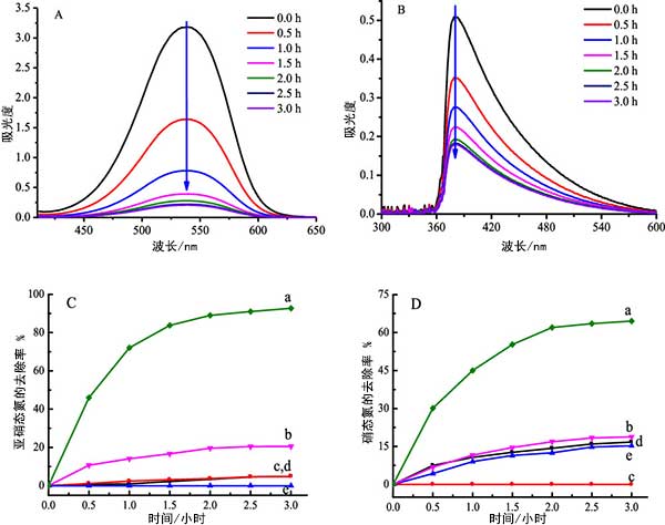 亞硝酸鹽和氨的記錄的紫外可見吸收光譜分別在圖3中。圖3AB明確顯示當(dāng)活性炭用作光催化劑時(shí),在厭氧條件下,亞硝酸鹽和氨的濃度與輻照時(shí)間同時(shí)下降。對(duì)照試驗(yàn)也在活性炭催化劑存在或不存在下進(jìn)行,照射或在黑暗中或不存在一種組分時(shí)進(jìn),亞硝酸鹽和氨的去除率如圖3CD所示。在活性炭鋅鐵氧體照射下,氨降解的平均去除率達(dá)到64.3%,而在沒有活性炭的情況下去除率僅為18.8%。結(jié)果明顯的是的活性炭鋅鐵氧體具有同時(shí)去除亞硝酸鹽和氨的光催化功能。