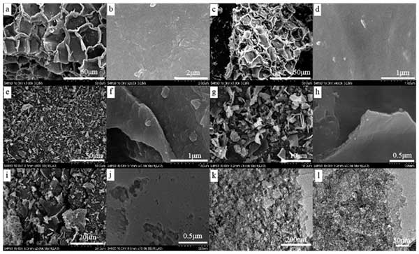 通過(guò)SEM和TEM研究了空氣氧化前后活性炭的微觀結(jié)構(gòu)(圖2)。在(圖2a,b)中,軟木材料呈蜂窩狀結(jié)構(gòu)并具有明顯的褶皺。在800℃碳化后,保留結(jié)構(gòu)并且包含該結(jié)構(gòu)的部分彼此緊密結(jié)合,看起來(lái)光滑(圖2c,d)。在350℃-450℃下空氣活化后,結(jié)構(gòu)單元被分離形成薄片(圖2e),這可歸因于細(xì)胞之間木質(zhì)素的降解。活性炭呈現(xiàn)出層狀空氣氧化后的結(jié)構(gòu)(圖2的e-j)的。350℃和400℃活化的活性炭樣品表面相對(duì)光滑,在0.5-1μm的分辨率下未觀察到明顯的孔結(jié)構(gòu)(圖2f,h)。當(dāng)氧化溫度升至450℃時(shí),活性炭的表面顯著變化并觀察到大量的孔。圖2j顯示450℃活化樣品顯示出具有裂縫和空隙的粗糙表面。TEM結(jié)果(圖2k,i)顯示450℃活化的活性炭具有三維(3D)互連框架的分級(jí)微/中孔結(jié)構(gòu)。這些孔可以有助于廢水中染料的吸附。