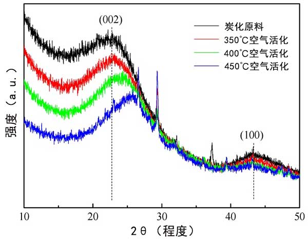 圖3顯示了空氣氧化之前和之后活性炭的XRD圖譜。所有樣品在~24°處顯示典型的寬峰,在~43°處顯示弱峰,分別對(duì)應(yīng)于石墨碳的(002)和(100)平面。所有樣品的寬峰和弱峰反映了活性炭的低度石墨化。與炭化原材料相比,隨著氧化溫度的升高,(002)峰逐漸向較高角度移動(dòng)。該運(yùn)動(dòng)表明空氣氧化后石墨結(jié)構(gòu)中(002)晶面的d-空間減小。結(jié)果表明,活性炭的空氣活化導(dǎo)致石墨結(jié)構(gòu)具有改善的致密性。