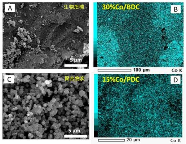 使用掃描電子顯微鏡(SEM)觀察由植物殼和酚醛樹脂的熱解獲得的活性炭的表面形態,并分別在圖1A,C中示出。可以看出,不同的碳前體產生不同的表面形態。生物質衍生的碳顯示出剛性和致密的結構,這是典型的木炭特征。而聚合物衍生的碳呈現具有粒子網絡的碳球,在球體之間產生大的空隙。然后將兩種活性炭用作氧化鈷的載體。為了觀察金屬氧化物在活性炭上的分散,進行了SEM與能量色散X射線(EDX)的元素映射。圖1B,D表示裝載在兩種材料中的氧化鈷的代表。所有都顯示鈷材料(在青色中顯示)在活性炭中的均勻分散。這表明通過浸漬方法中描述的簡單化學計量計算很好地實現了元素鈷的目標負載。換句話說,上述結果清楚地顯示了制備氧化鈷活性炭的成功制備步驟。