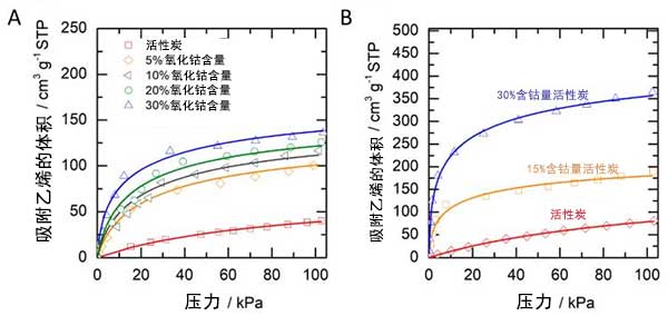 測試氧化鈷浸漬的活性炭的性能以進行乙烯吸附。圖2A顯示在具有和不具有0-101kPa壓力范圍的氧化鈷活性炭中的乙烯吸附等溫線。吸附乙烯的體積定義為標準溫度和壓力下的體積。通常,可以看出乙烯吸收隨著壓力的增加而增加。大量乙烯吸附至40kPa壓力。當將壓力增加到40kPa以上時,所有樣品可以進一步吸附少量乙烯(添加10%-25%)。氧化鈷浸漬的活性炭是無負載的活性炭兩倍的乙烯吸附量,它清楚地表明氧化鈷在增強活性炭對乙烯吸附方面效果比較好。增加氧化鈷的含量進一步增加了乙烯在氧化鈷浸漬的活性炭上的吸附能力。當使用30%氧化鈷時能達到較高吸附容量。