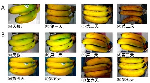 圖3A,B分別顯示了在沒有和使用氧化鈷浸漬的活性炭在封閉存儲期間的水果條件的日常記錄。使用活性炭15%氧化鈷材料,進行半定量檢查(即顏色和棕色區域)。當棕色主要出現時,長期保存時間被定義,并且香蕉從束中掉出來。當將香蕉存放在沒有活性炭吸附劑的封閉盒子中時,水果很快變得腐爛。僅在第三天,一束香蕉已經從束中掉出來并出現棕色斑點。使用活性炭吸附劑情況下,可以清楚地看到水果保存時間的延長。相對于沒有活性炭,顏色的變化被延遲(圖3B)。結果表明氧化鈷浸漬的活性炭作為乙烯清除劑在儲存系統中的效果,因此延長了水果的儲存壽命。
