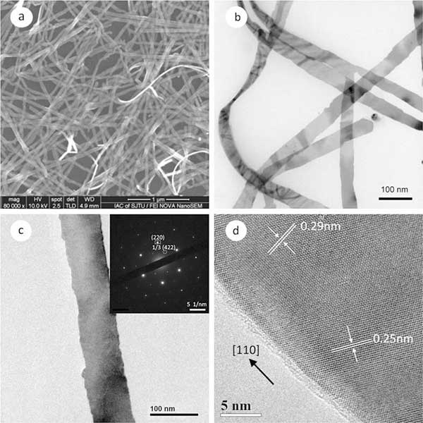 圖1顯示了在活性炭上生長的銀納米帶的典型電子顯微鏡(EM)圖像。SEM圖像(圖1a)顯示獲得了豐富的線狀產物,具有非常少的準球形顆粒雜質。圖1b是銀納米帶的典型TEM圖像。該圖中所示的納米帶的平均寬度為約45納米。從左側附近的扭曲納米帶測量的厚度為約9納米。位于TEM網格上的這種平坦且光滑的納米結構也通過右側的莫爾圖案來證實,其源自具有不同晶體取向的兩個或三個納米帶的堆疊。圖1c呈現單個納米帶的TEM圖像。其選擇區域電子衍射(SAED)圖案插入右上角,具有六重對稱性。