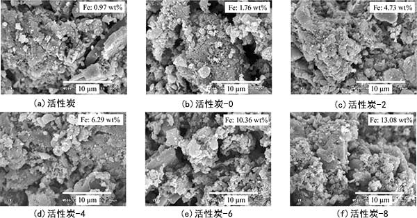 載鐵活性炭的SEM照片如圖1所示。載鐵活性炭具有片狀石墨填充結構的表面形態,其顯示產生大量微孔。對于所有活性炭,觀察到小的聚集體,其看起來更亮并且在活性炭的較暗表面上得到支撐。細氧化鐵顆粒傾向于覆蓋活性炭的表面而不是均勻地分散在整個表面上。作為四氧化三鐵的添加量增加,活性炭表面的聚集增加。通過能量分散X射線(EDX)分析(未顯示),證實聚集體是含鐵化合物。樣品的鐵含量顯示在圖1中每張圖的右上角。
