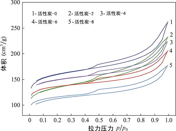氮等溫線:圖2顯示了活性炭的氮吸附-解吸等溫線。可以看出,根據IUPAC分類,所有活性炭的等溫線屬于具有磁滯回線的Ⅳ型等溫線,表明活性炭具有中孔。隨著四氧化三鐵添加量的增加,活性炭的等溫線低于載鐵活性炭的等溫線,表明比表面積減小,孔隙增大。