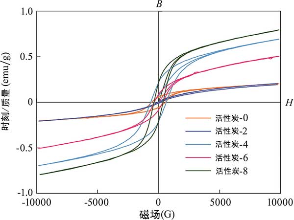 活性炭的磁滯回線如圖3所示。隨著鐵含量增加,活性炭的飽和磁化強度首先降低并隨后增加。活性炭的飽和磁化強度值與活性炭中殘留的四氧化三鐵和金屬鐵的量有關,因為它們具有磁效應。活性炭的特定磁化率是磁分離的重要參數之一。