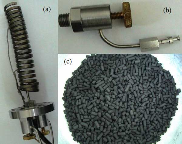 圖1:活性炭吸附池的一些組件:(a)組裝到池底的電加熱器(b)閥(c)活性炭。