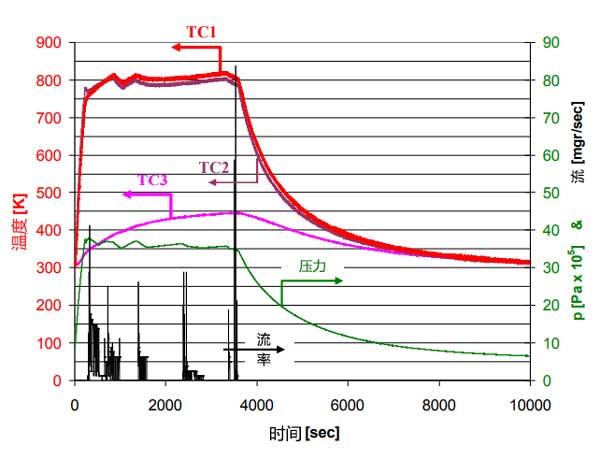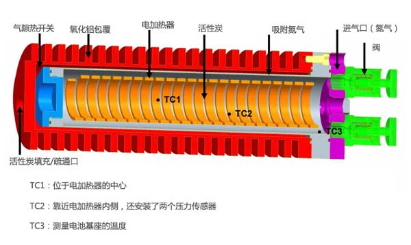 排出壓力約為3.5MPa的實驗結果如圖4所示。250秒后,加熱功率為500W,中心溫度超過476℃,而電池底座溫度則為76℃。然而,將電池達到其穩態溫度分布需要大約60分鐘,其中電池基座中的溫度為166℃。活性炭的溫度不允許超過526℃。 60分鐘,加熱功率逐漸降低,以保持最高溫度低于526℃,壓力高于3.5MPa。由于電池基座的溫升速率隨時間降低,輸送的氮量也減少了。因此,在15分鐘后結束放電階段僅從活性炭吸附池釋放4.6g氮。圖4中的冷卻階段持續約100分鐘,并且如果放電階段在15分鐘后結束(此時基礎溫度僅為126℃),則可以減少冷卻階段。活性炭中的加熱和冷卻速率以及溫度分布與數值分析估計的相似。這表明簡化的數值傳熱分析為吸附池中的傳熱提供了令人滿意的估計。