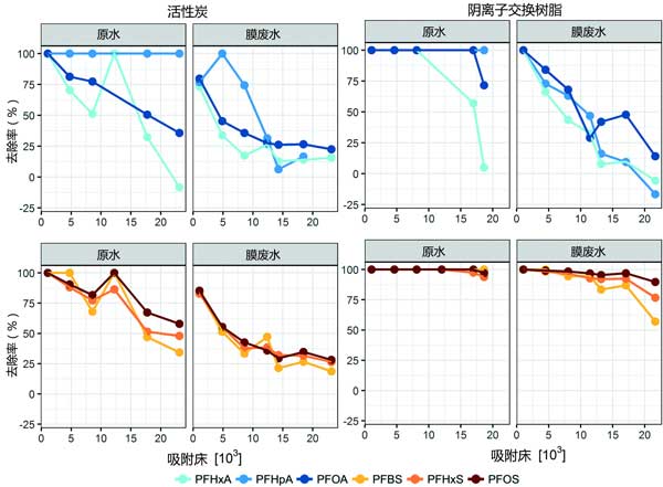 實驗總計進行了12周,每兩周取樣。這導致所有活性炭色譜柱的實驗運行時間為24個,分別處理原水和膜廢水的陰離子交換樹脂色譜柱。在每次采樣之后每周對所有柱進行反洗,以模擬典型的全尺寸操作。總共分析了15種全氟烷基物質,將吸附材料相對于全氟烷基物質去除的性能與柱吸附模型的性能進行了比較。
