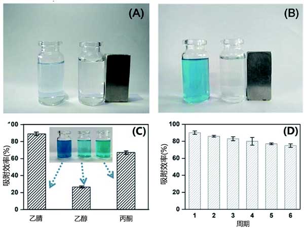 圖3:未加標(A)和加標(B)孔雀石綠廢水中活性炭吸附性能的照片,解吸溶液(C)的影響和活性炭的可重復使用性(D)。