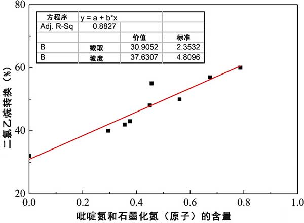 氮摻雜活性炭的活動(dòng)點(diǎn)如圖3所示,隨著吡啶氮和石墨氮的增加,二氯乙烷轉(zhuǎn)化率呈線性增加,不論氮資源的變化如何,推斷吡啶氮和石墨氮與二氯乙烷的催化脫氯化氫密切相關(guān),是有效的氮原子。