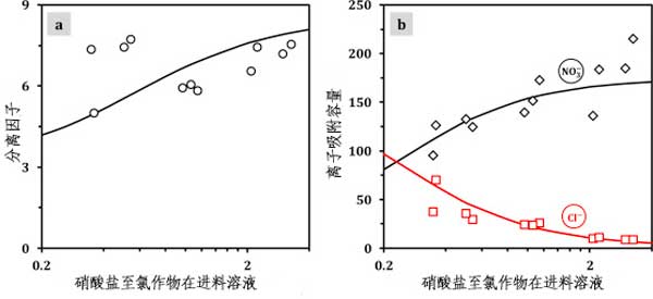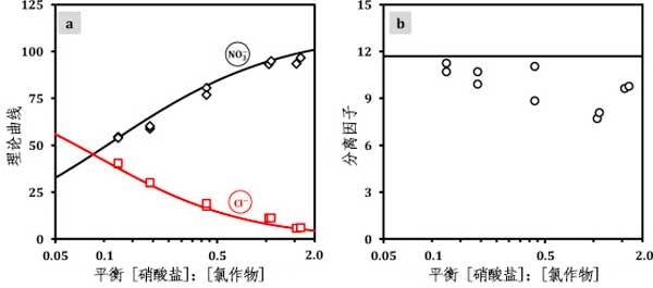 圖2a和圖2b顯示了平衡電吸附數(shù)據(jù)分離因子沒(méi)有和離子吸附容量作為的函數(shù)硝酸鹽至氯化物溶液中的濃度比。我們觀察到了平衡電吸附數(shù)據(jù)與離子吸附容量一起增加硝酸鹽至氯化物進(jìn)料溶液中的濃度比。在圖2b中,我們看到隨著初始增加硝酸鹽至氯化物氯-濃度比,濃度之差硝酸鹽和氯化物在微孔中增加。然而,在達(dá)到平衡之前,優(yōu)先離子電吸附由初始濃度比確定:溶液中具有最高濃度的離子主要是電吸附的。