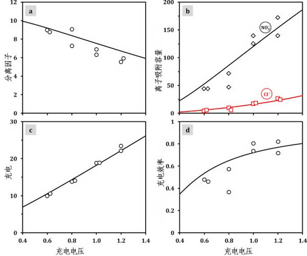 圖3a顯示了這一點(diǎn)分離因子隨充電電壓降低,但親和效應(yīng)不會(huì)減少很多,并且在高電壓下也繼續(xù)發(fā)揮重要作用。充電和離子吸附容量隨充電電壓的增加而增加。圖3d顯示充電效率遠(yuǎn)低于單位,這可以通過(guò)在充電步驟開始時(shí)從活性炭表面解吸共離子來(lái)解釋。
