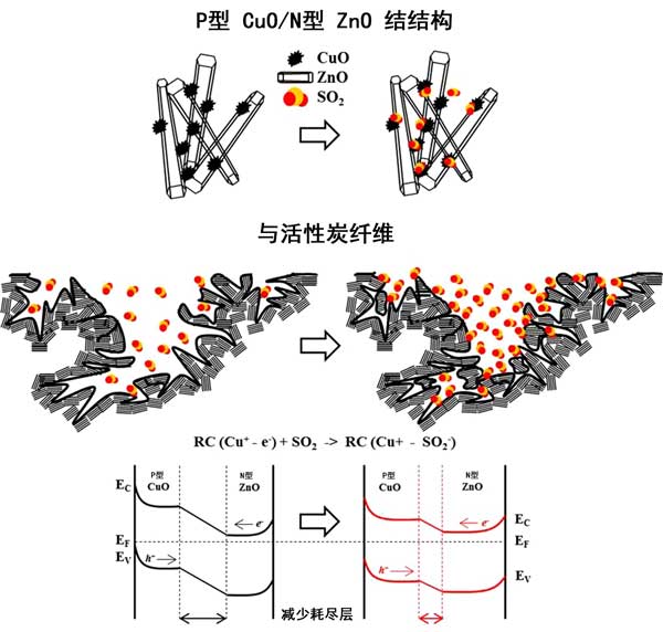 在圖3中,CuO顆粒隨機(jī)分散在ZnO花表面上。當(dāng)CuO顆粒與ZnO花結(jié)合時(shí),在p型CuO顆粒和n型ZnO花之間的界面處形成p/n結(jié)。在這種機(jī)制下,電子從n型ZnO轉(zhuǎn)移到p型CuO,并且空穴通過p型CuO到達(dá)n型ZnO,直到在系統(tǒng)中建立均勻的費(fèi)米能級(jí),從而導(dǎo)致能帶在耗盡層彎曲。然而,當(dāng)CuO-ZnO組合結(jié)構(gòu)暴露于SO 2時(shí),電子通過Cu +之間的氣敏反應(yīng)釋放和SO帶負(fù)電的2 -離子。還原的SO 2分子與CuO中的孔結(jié)合,從而減少了耗盡層和電阻。這種現(xiàn)象可通過降低電阻來實(shí)現(xiàn)良好的SO 2檢測(cè)。因此,p型CuO和n型ZnO的傳感響應(yīng)的貢獻(xiàn)代表了傳感器的主要特性,而活性炭纖維的比表面積在SO 2傳感特性中起著重要的作用。