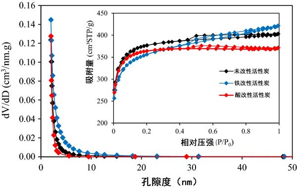 表面積和孔徑?jīng)Q定了吸附劑的吸附性能。活性炭具有大量的內(nèi)部孔,具有較大的比表面積。HNO 3和Fe 對(duì)改性活性炭的BET表面積,BJH平均孔徑和孔體積均有不同程度的變化。在常溫條件下,濃HNO 3在活性炭表面溶解了一定的灰分,有助于進(jìn)一步擴(kuò)大多孔結(jié)構(gòu)。但是,濃HNO 3還腐蝕了活性炭的結(jié)構(gòu),從而部分破壞了內(nèi)部通道結(jié)構(gòu)并降低了活性炭的比表面積。至于鐵改性的活性炭,內(nèi)表面的鐵材料層堵塞了某些通道,從而降低了比表面積,平均孔徑和孔體積。