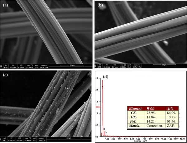 圖2示出了原始活性炭纖維的SEM圖像,并將其顯示,活性炭的表面有凹槽和平滑的整體,其中有幾個(gè)裂縫和小斑點(diǎn)(圖2的B)。HNO的表面形貌和鐵改性活性炭變?yōu)榇植?圖2c)和表面覆蓋由絮狀直徑在約數(shù)百納米的。如圖2d所示,EDX分析表明主要元素為C,O和Fe。觀察到在活性炭表面上載有一層約20-80nm的鐵納米顆粒。