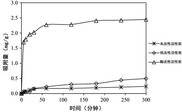 吸附動(dòng)力學(xué)主要用于確定吸附過(guò)程的保留時(shí)間。圖3顯示了砷離子在活性炭纖維上的吸附動(dòng)力學(xué)。如圖3所示 ,砷離子的吸附隨著接觸時(shí)間的增加而增加,并且考慮到處理效率,吸附平衡時(shí)間固定為60分鐘。與活性炭的吸附過(guò)程相比,F(xiàn)e和HNO 3改性后的活性炭吸附平衡時(shí)間增加,但在300分鐘時(shí)的吸附容量分別為0.236 mg/g,0.493 mg/g和2.45 mg/g。因此,鐵改性的活性炭提高了去除砷離子的吸附能力。