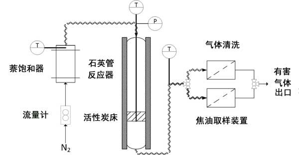 萘轉(zhuǎn)化試驗(yàn)已在圖1所示的實(shí)驗(yàn)設(shè)備中進(jìn)行,該設(shè)備顯示了其主要部分:進(jìn)料系統(tǒng),反應(yīng)器,采樣/清潔裝置和氣體分析儀。進(jìn)料系統(tǒng)由用于調(diào)節(jié)氮?dú)饬髁康霓D(zhuǎn)子流量計(jì)和萘飽和器組成,以獲取摻有焦油的物流。飽和器和反應(yīng)器之間的管道應(yīng)保持在150°C以上,以免萘發(fā)生冷凝。所使用的反應(yīng)器是內(nèi)徑為14 mm,總高度為600 mm的立式管狀石英反應(yīng)器。將活性炭床放在反應(yīng)器內(nèi)部的玻璃粉上方,該玻璃粉位于距頂部430毫米處。床的溫度通過(guò)K型熱電偶在床的中央進(jìn)行測(cè)定。在焦油采樣期間,通過(guò)切換三通閥,將反應(yīng)器出口處的氣體導(dǎo)入采樣裝置,并在其余時(shí)間內(nèi)導(dǎo)入清潔裝置。采樣裝置由三個(gè)撞擊器組成,在0°C時(shí)充滿(mǎn)異丙醇。專(zhuān)用實(shí)驗(yàn)表明,在本研究分析的條件下,該設(shè)備的捕獲效率超過(guò)99%。借助帶有熱導(dǎo)檢測(cè)器(TCD)的微型氣相色譜儀分析清潔區(qū)出口處的氣體,以在線測(cè)定短鏈烴(從乙炔到苯)和分子氫。實(shí)驗(yàn)裝置的更多詳細(xì)信息可以在其他地方找到。