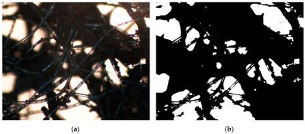 活性炭介質250倍放大的顯微照片,然后用數值計算出與圖像其余部分相比具有較暗陰影的區域的面積(被活性炭介質覆蓋的區域)。首先,我們使用常規的多通道和彩色圖像轉換為灰度圖像,然后生成圖像,其中每個像素的值均為0(白色像素)或1(黑色像素)(圖1)。接下來,我們應用例程,對于給定的灰度圖像,該例程確定由黑色像素簇覆蓋的整個灰度圖像的比例。這種方法使我們能夠粗略評估活性炭復合材料中活性炭附聚的均勻性,而無需考慮基礎非織造布的不均勻性,因為例程省略了透明PET纖維。