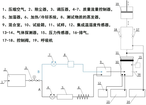 在測試過程中,干燥的壓縮空氣通過裝有減壓器的顆粒過濾器輸送到系統中,該壓力過濾器的調節范圍為0-8 bar。然后將其分為兩條線(圖2):用于溫度和相對濕度調節的線A和用于調節測試室內測試物質濃度的線B。將來自管線A的給定溫度和相對濕度的空氣與來自管線B的激發蒸汽在混合室中混合,然后將活性炭鎖定在直徑為11.3的氣動樣品架中,并將其引入測試室。另外,在脈動流測試期間使用了連接到測試室出口的呼吸機。呼吸機設定為25個循環/分鐘和2 L/沖程,這對應于每分鐘25吸氣和25呼氣,呼吸量為2L。呼吸機的氣流模式為正弦曲線。脈動流量測試期間的挑戰濃度得到補償,以確保將總負載標準化為穩態流量條件。實驗以四個變體進行,每個變體評估不同因素(即挑戰濃度,相對濕度,挑戰流速,挑戰流型)對活性炭復合材料吸附特性的影響。