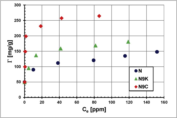 圖2提出了在3 pH值下獲得的三種被測活性炭表面上聚丙烯酸的吸附等溫線(由于在這種pH條件下聚合物的最高吸附)。可以看出,在N活性炭表面上觀察到最低的聚丙烯酸吸附。化學(N9K)和物理(N9C)活化后的改性固體樣品顯示出對聚合物大分子的更大吸附親和力。對于N9C而言,這種效果尤為明顯。為了解釋這些依賴性,應分析聚丙烯酸大分子電離的變化(直接影響其在溶液中的大小,并確定它們進入具有特定平均直徑的活性炭孔中的可能性),以及隨著pH值增加,固體表面電荷密度的變化。提出了不同pH值溶液中聚丙烯酸大分子的特征。在pH 3時,聚合物羧基的解離度極小,而在pH 4.5時,離子化和中性羧基的解離度相同(解離度達到50%)。反過來,在pH 6和9時,聚合物鏈發生總電離。多元酸大分子電離的變化決定了它們的大小-解離度的增加導致鏈的發展從卷曲結構(在pH 3)到顯著延伸的構象(在pH 9)。此外,電位滴定結果(將在本文的其他部分進行討論)表明,活性炭表面pH pzc的變化范圍為5.33-6.82。這表明在pH值為3和4.5時,固體表面帶有正電荷,并且陰離子聚合物吸附的靜電條件是有利的。另一方面,在pH 9時,在完全解離的聚(丙烯酸)鏈與帶負電的固體表面之間會發生強靜電排斥。
