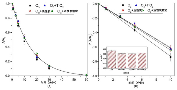 圖2給出了紡織原料廢水的臭氧化和催化氧化結果。可以看出,TiO 2,活性炭或載鉑活性炭催化劑均未產生任何可見的催化活性。收集所有催化劑的實驗數據,作為在596 nm處的吸光度值,它對應于活性黑5染料(RB5)的顏色,可以通過相同的趨勢線粗略地近似(圖2a)。相應地,計算出的除色偽一級反應速率值對于所有催化劑幾乎都相同,并且不高于單次臭氧化(圖2b)。由于缺乏任何催化劑的催化作用,可以用紡織廢水基質來解釋。問題的共同點是催化劑的吸附能力。即使每種測試的催化劑的特征在于不同類型的吸附活性中心,所有這些催化劑都可能被表面活性劑的殘留物失活,這種表面活性劑通常在紡織品的工業染色操作中作為助劑使用,并建立了這種催化劑的基質。