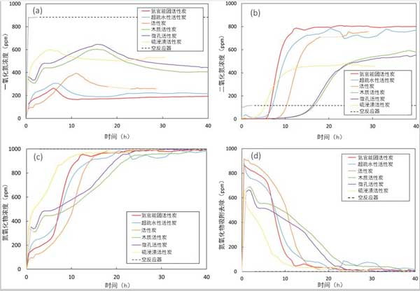 圖1:在環境溫度和壓力下的干燥測試條件下,不同活性炭在NO氧化過程中一氧化氮的濃度曲線。