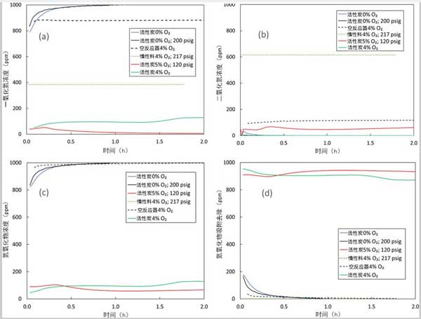 在大氣或高壓下沒有氧氣的情況下進行的基線活性炭測試中吸附的NO,NO 2,氮氧化物和氮氧化物的濃度曲線證實,即使在200 psig的高壓下也不會發生NO 2的形成或大量NO的吸附。在沒有氧氣的情況下,活性炭催化劑上沒有NO吸附。即使在200 psig下,NO也無法物理吸附在活性炭表面上,而且氧氣的存在也是必不可少的以促進NO在化學吸附的氧位點上的化學吸附。
