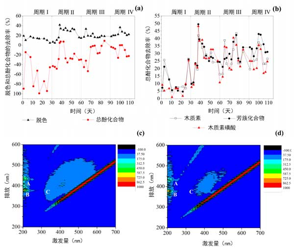 圖2:(a)去除顏色和總酚類化合物。(b)去除木質素,芳族化合物和木質素磺酸化合物。(c)富集的熒光發射和激發矩陣。(d)廢水排放和熒光激發矩陣。