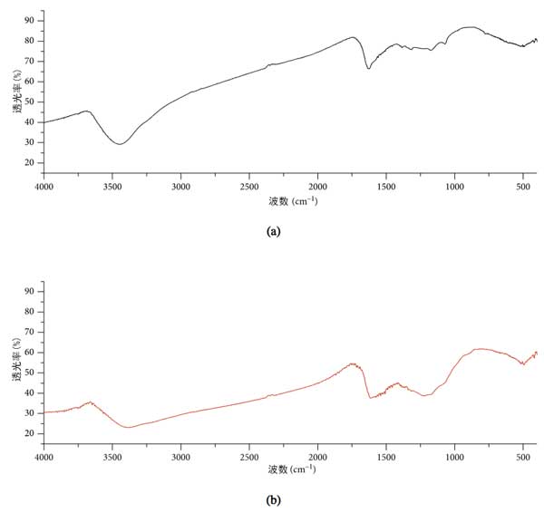 圖1:(a)之前和之后(b)鉛(II)離子吸附之前活性炭的FTIR分析。