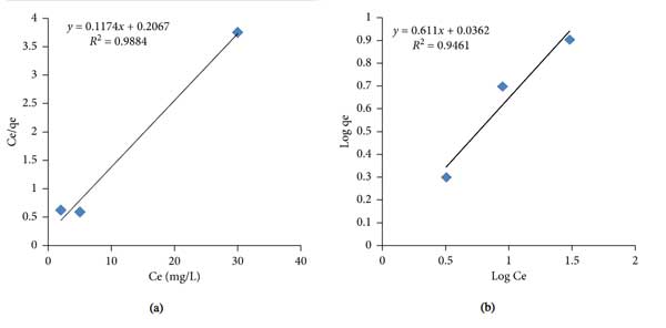 圖2:活性炭上鉛離子吸附的(a)Langmuir圖和(b)Freundlich圖。