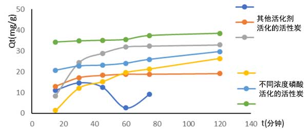 活性炭的吸附時間影響可從圖1看出,活性炭吸附分三步進行:第一是在最初的30分鐘內,污染物的吸附量很快就被確定了,這可以用在吸附劑的外表面存在大量空置的結合位點,這使得吸附劑易于吸附到該表面。第二在31分鐘后,吸附速率降低,過程緩慢。活性炭的其他位置達到飽和后,污染物顆粒將遷移到吸附劑內部。由于易于接近,因此吸附過程緩慢:顆粒內擴散。第三從80分鐘開始,我們觀察到一次接觸,活性炭已達到其最大容量。我們可以說這些吸附劑的平衡時間是80分鐘。然而,磷酸活化的活性炭吸附量的演化曲線顯示,在最初的30分鐘內,污染物的吸附量顯著增加,此后,污染物的吸附量急劇下降,這將是一種產物解吸。這一現象在其他吸附劑中是不可見的,這可能意味著可用孔隙的數量和結合力隨著所用活化劑濃度的增加而增加,這一點還通過碘值和亞甲基藍的值進行了驗證。