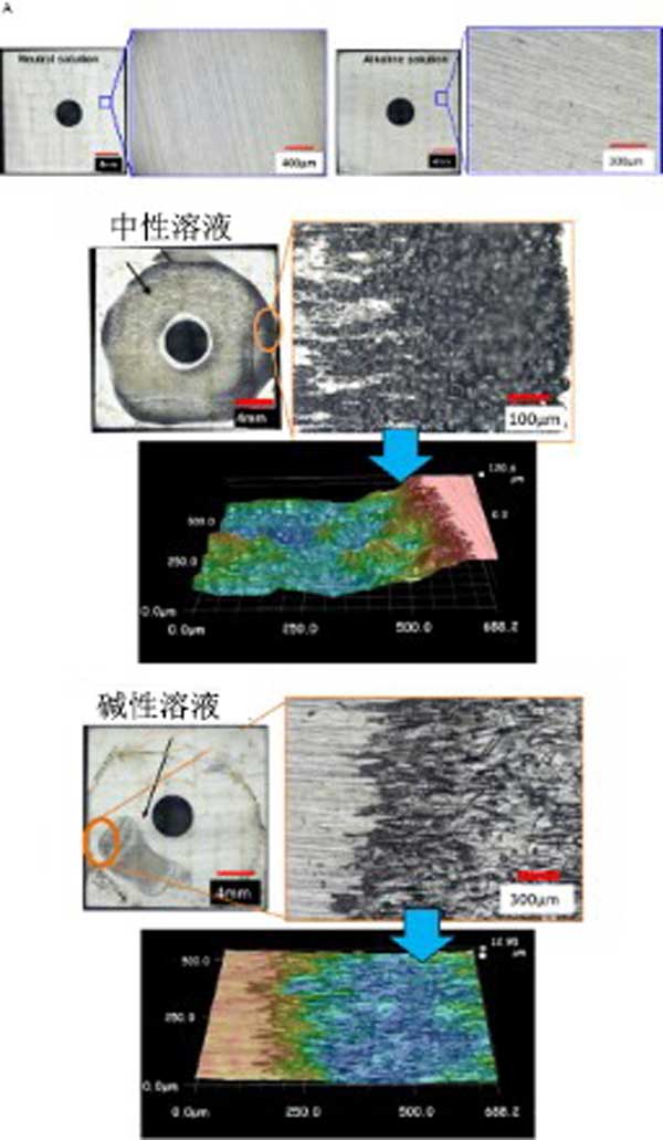 使用光學(xué)顯微鏡觀察實驗后樣品的表面形態(tài),如圖3所示。在中性和堿性溶液中未與活性炭接觸的樣品中未觀察到縫隙腐蝕。另一方面,在中性和堿性測試溶液中與活性炭接觸的樣品上發(fā)生縫隙腐蝕。這些結(jié)果清楚地表明,當(dāng)樣品與活性炭接觸時,縫隙腐蝕敏感性增加。在中性測試溶液的情況下,最大腐蝕深度為130μm并且縫隙腐蝕傳播以覆蓋樣品的幾乎所有褶皺區(qū)域。在堿性測試溶液的情況下,最大腐蝕深度為25μm并且腐蝕區(qū)域遠(yuǎn)小于中性溶液的情況。這些結(jié)果表明,在中性溶液的情況下腐蝕區(qū)域和深度更大,這表明在吸附塔中發(fā)生實際腐蝕。在堿性溶液的情況下腐蝕面積和深度較小的原因被認(rèn)為是Fe(OH)2的溶解速率的事實堿性溶液減少,這導(dǎo)致腐蝕速率降低。基本上,在陽極部位的pH降低至去鈍化pH是縫隙腐蝕開始和傳播所必需的。考慮到這個方面,還可以解釋縫隙腐蝕行為的差異。